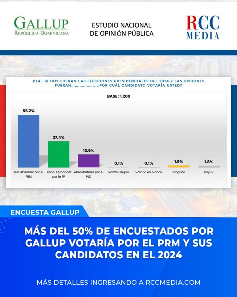 Los datos de la más reciente entrega de la encuesta Gallup para el Grupo RCC Media que se publicaron este martes en el programa “Sol de la Tarde”, que se transmite por Zol 106.5 F.M., revelaron que más del 50% de los 1,200 encuestados por la firma votaría por los candidatos del Partido Revolucionario Moderno (PRM) en las elecciones del 2024.